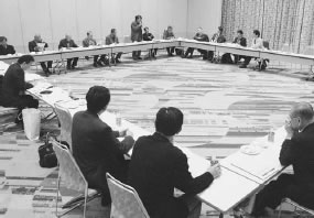 亀岡市・船井医師会との懇談会は1月31日、ガレリアかめおかで開催。地区から17人、協会から4人が出席し、船井医師会・山田智裕理事の司会で進められた。